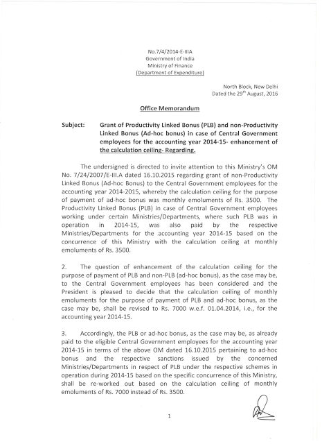 ஆனால் பின்னர் இந்த உத்திரவு மத்திய அரசு ஊழியர்களுக்குப் பொருந்தாது என்று அறிவிக்கப்பட்டதும் உங்களுக்குத் தெரியும் . ஆனால் நேற்று மத்திய அரசின் நிலையில் மாற்றம். 29.8.2016 அன்று மத்திய நிதி அமைச்சகத்தால் 2014-2015 நிதி ஆண்டிலிருந்து மத்திய அரசு ஊழியர்களுக்கு ( PLB மற்றும் ADHOC BONUS) போனஸ் உச்சவரம்பு ரூ. 3500/- இலிருந்து ரூ. 7000/- ஆக உயர்த்தி வழங்கப்படும் என்ற உத்திரவை திடீரென வெளியிட்டுள்ளது.